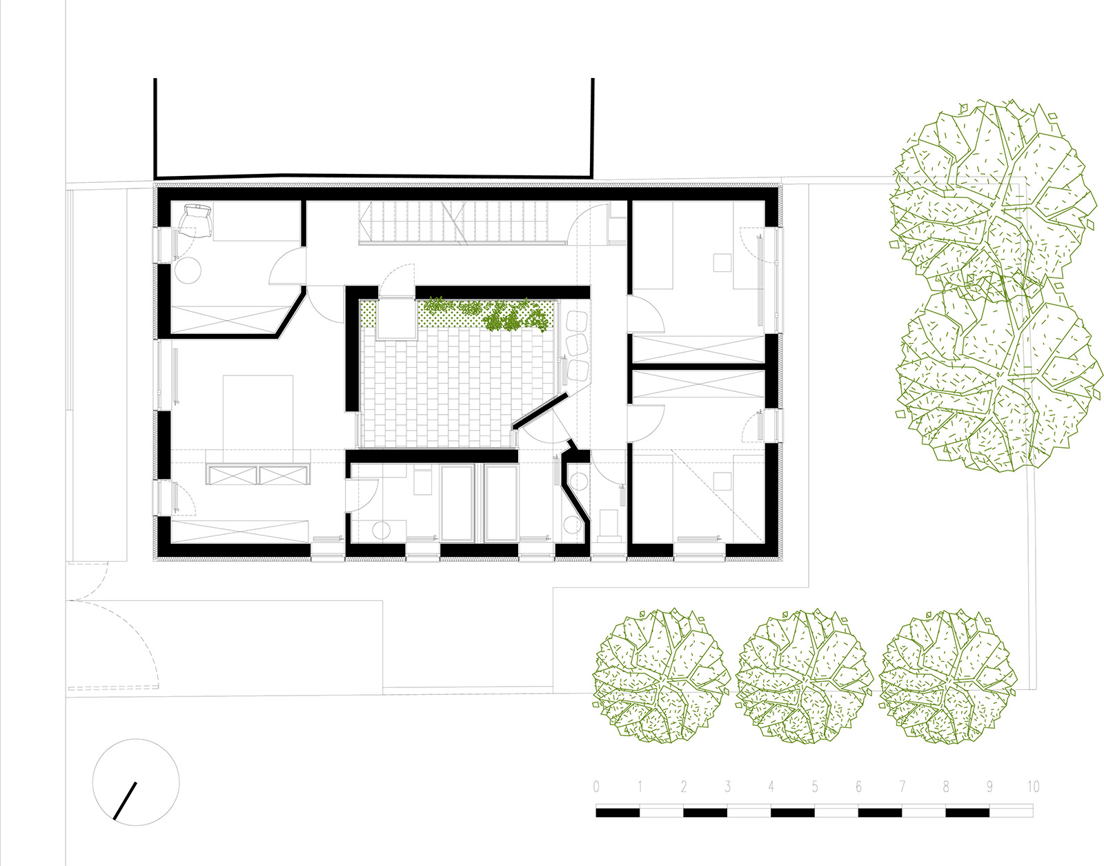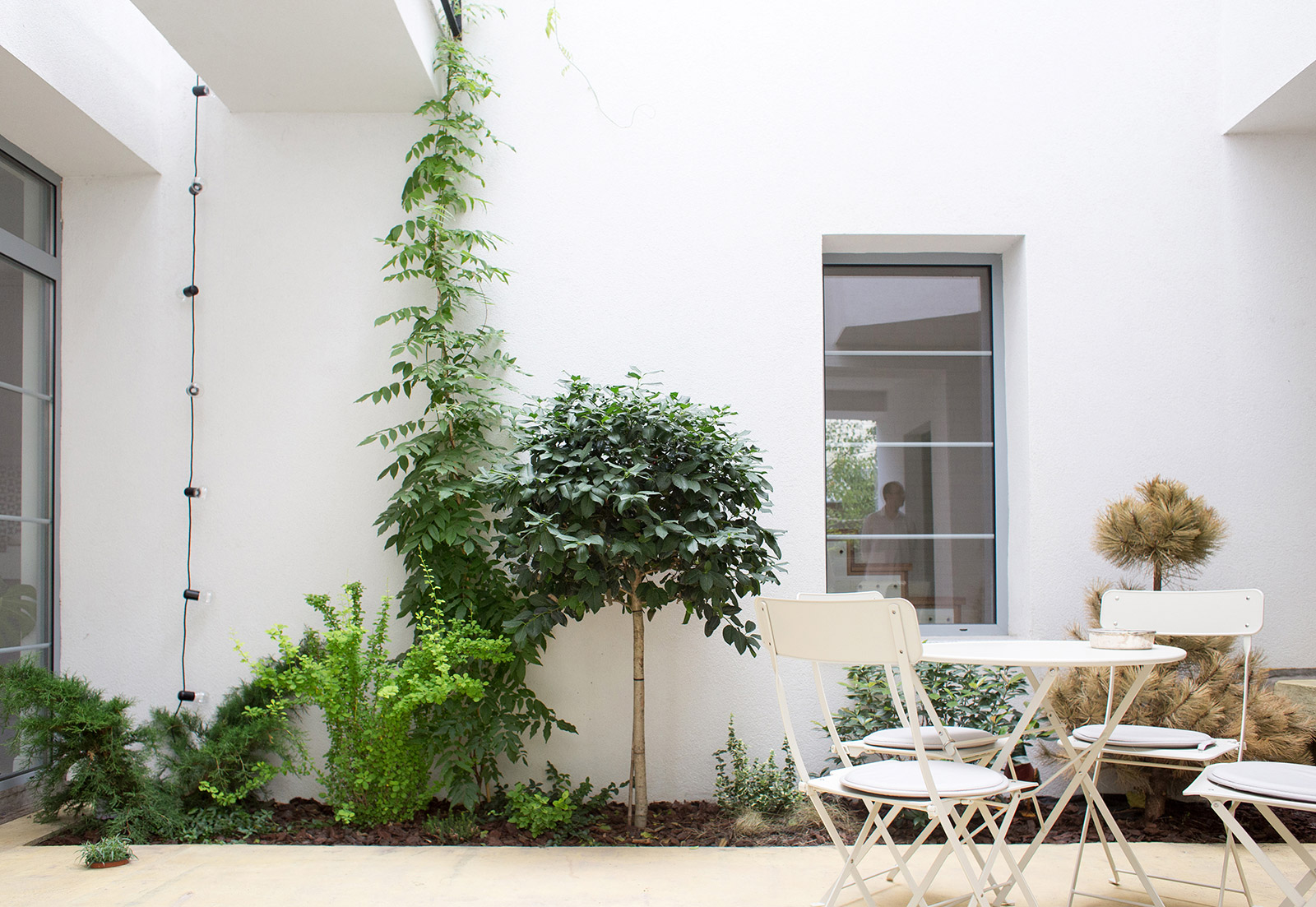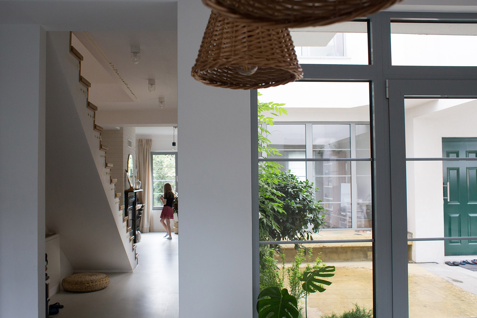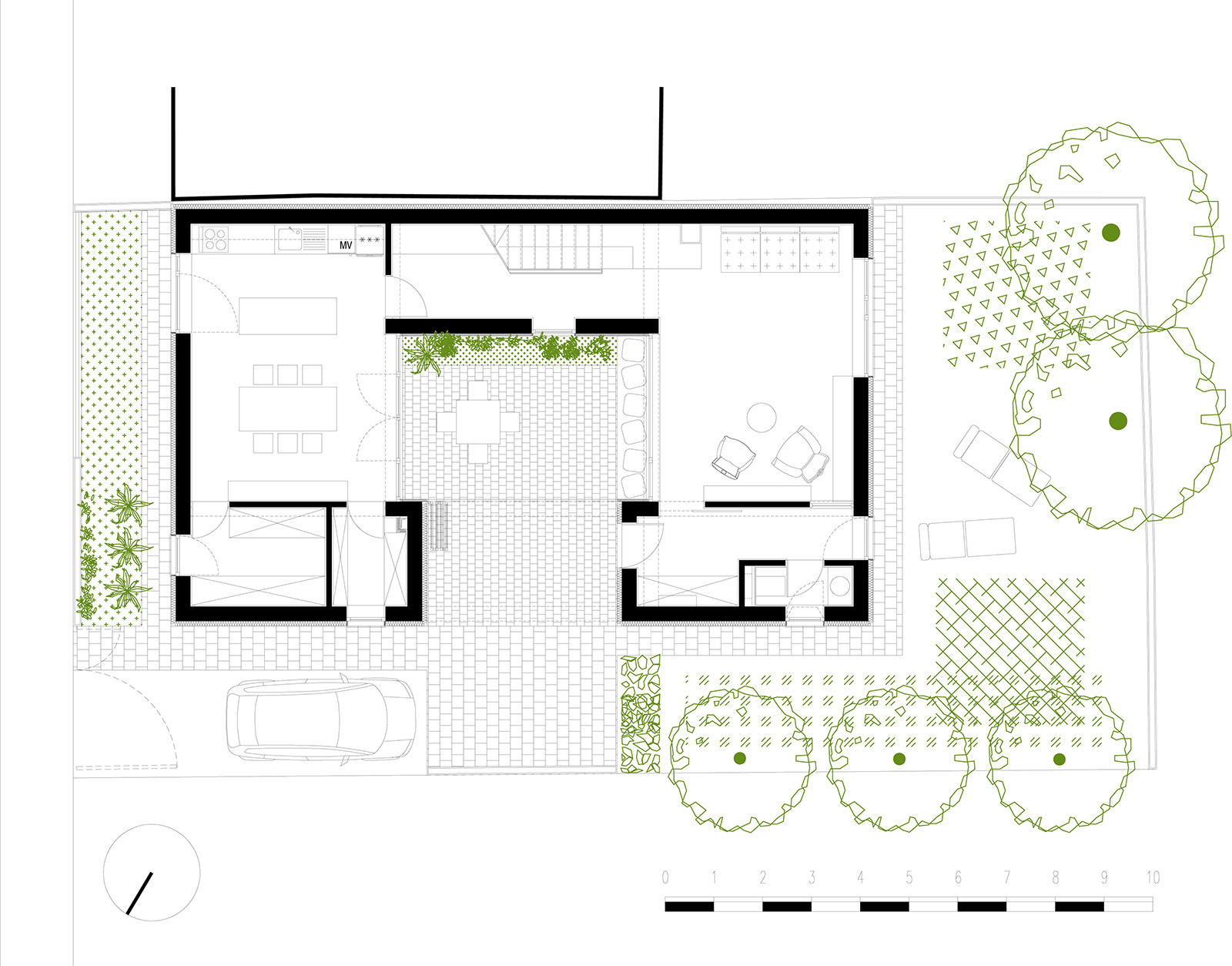 In a residential area typical for semi-detached houses, the project introduces an intermediate space, distinct from the front, lateral and back gardens. Placed in the middle of the house, this light and ventilation courtyard is at the same time an elegant extension of the front entrance, a place to enjoy a eating or sitting outdoors.