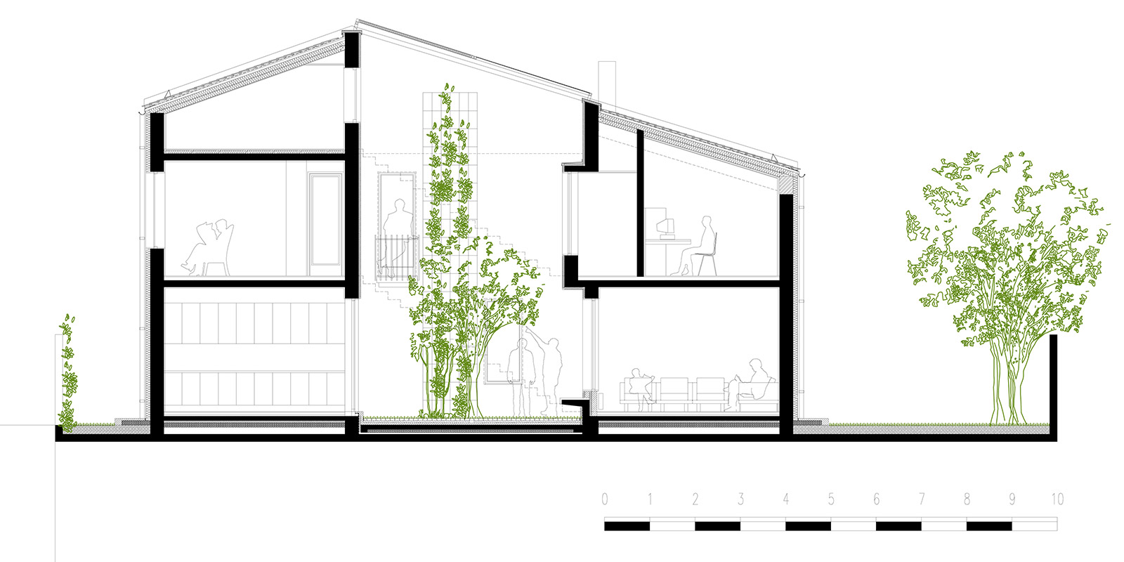 The house revolves around this void and opens towards it at all levels. The courtyard becomes responsible for introducing a playful depth to the experience of the other areas of the house. At ground level, the surface of the courtyard is dedicated to unprogrammed use. The courtyard is also virtually amplified by projecting one of its walls to the property limit. A small balcony, a bow window and a crossing enrich the use of its height and constitute small events that enhance its spatial experience.