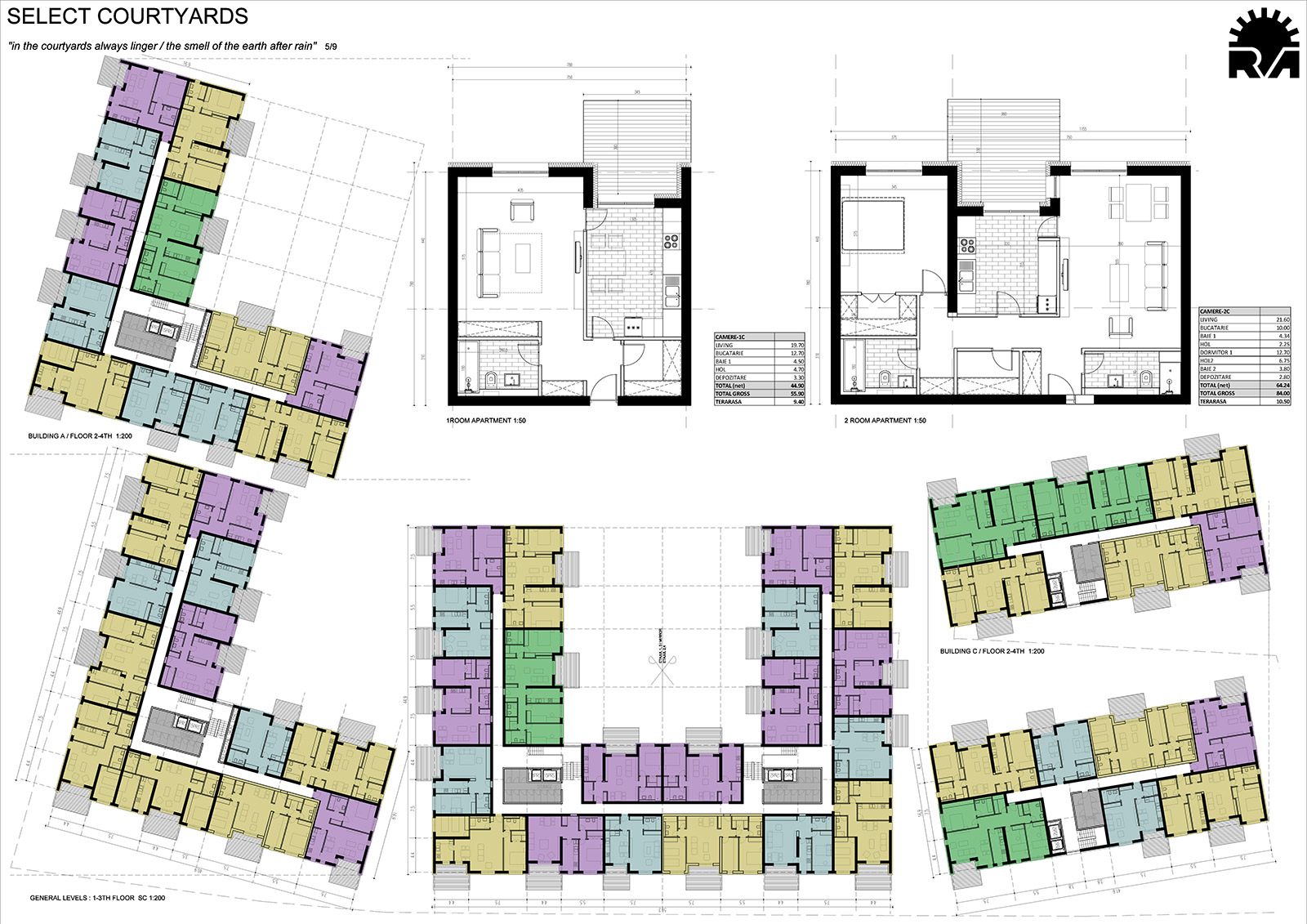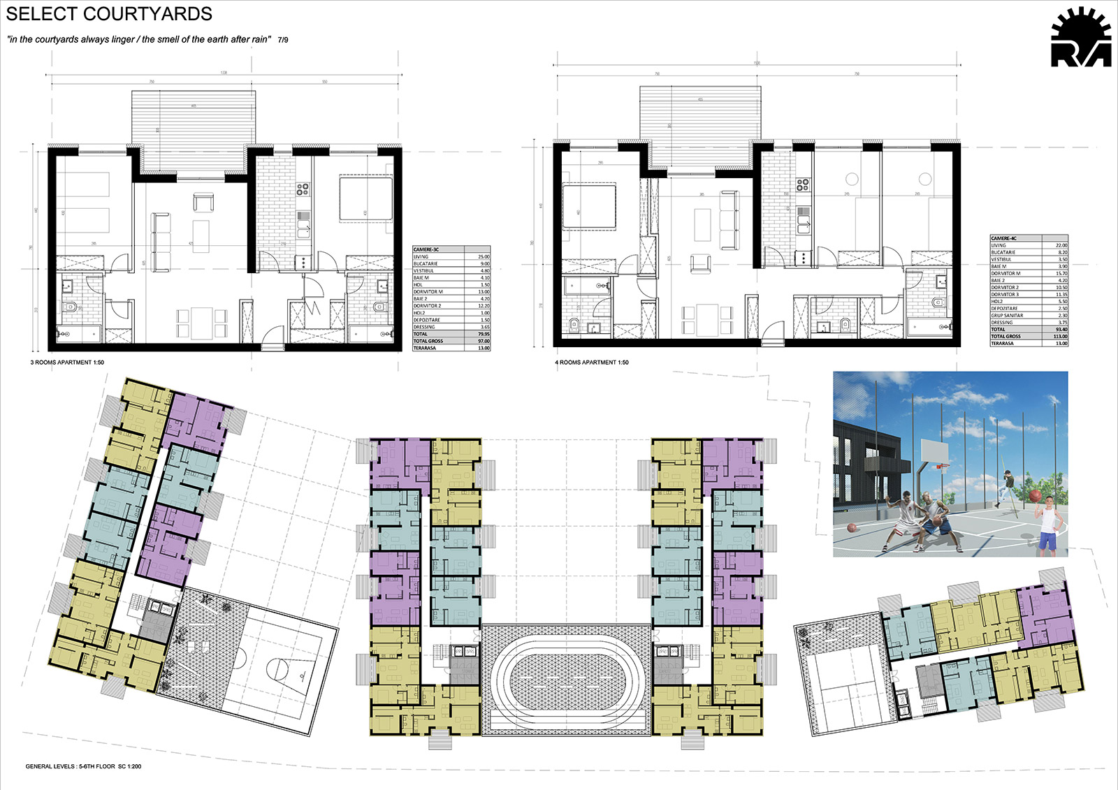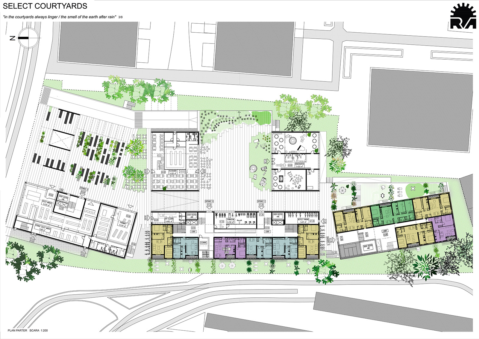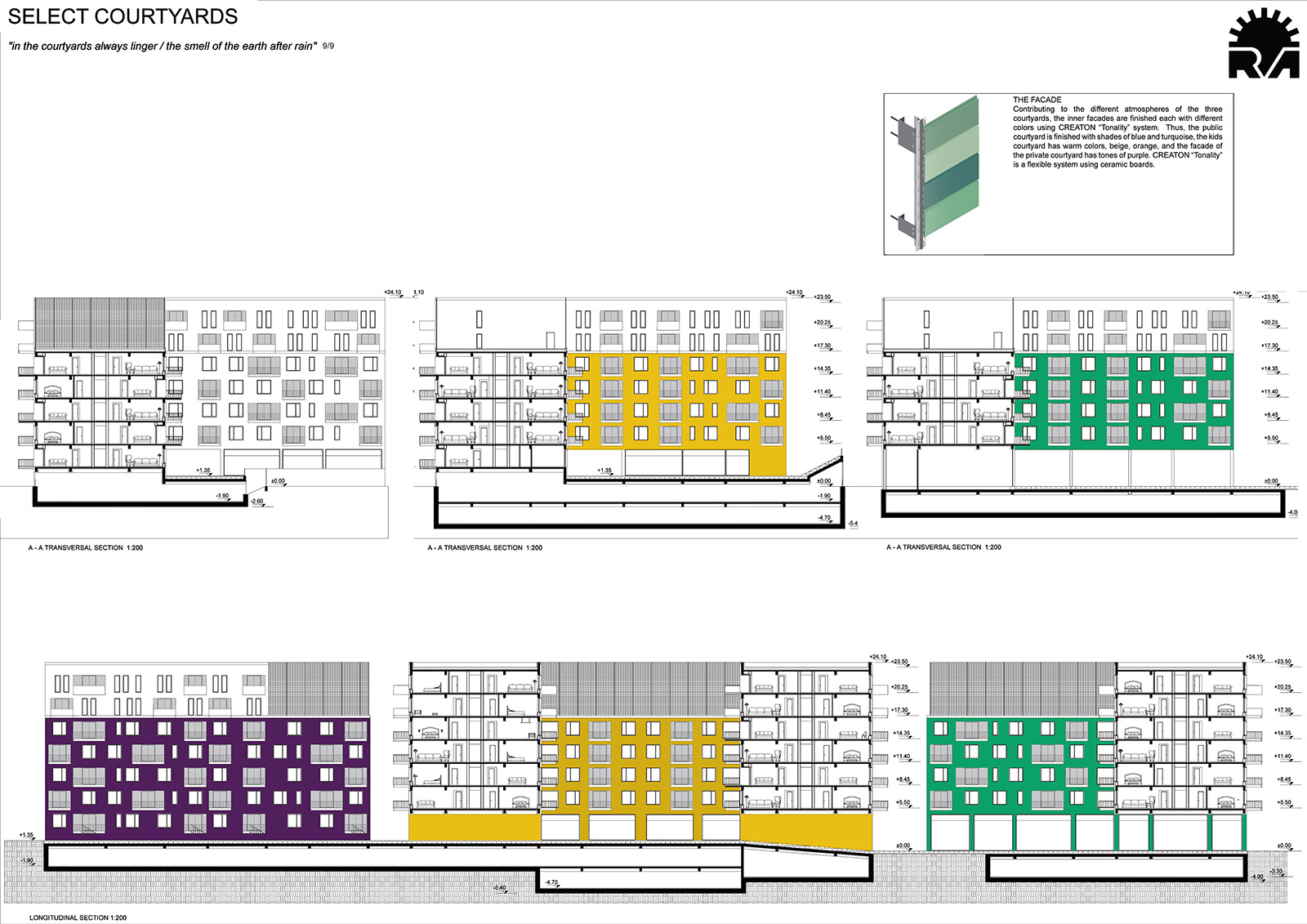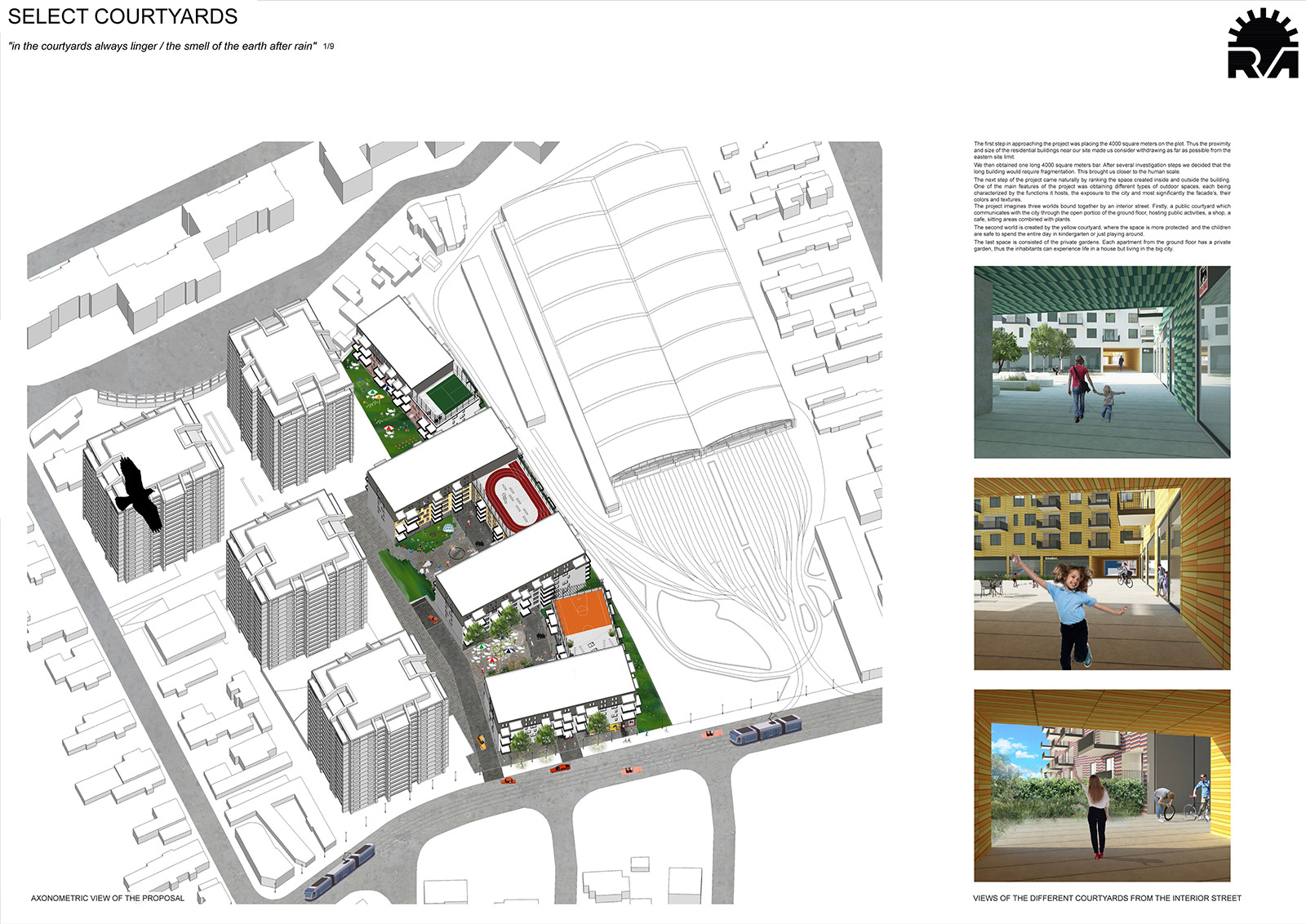 The project imagines three worlds bound together by an interior street. Firstly, a public courtyard which communicates with the city through the open portico of the ground floor, hosting public activities, a shop, a cafe, sitting areas combined with plants. The second world is created by the yellow courtyard, where the space is more protected and the children are safe to spend the entire day in kindergarten or just playing around. The last space is consisted of the private gardens. Each apartment from the ground floor has a private garden, thus the inhabitants can experience life in a house but living in the big city.