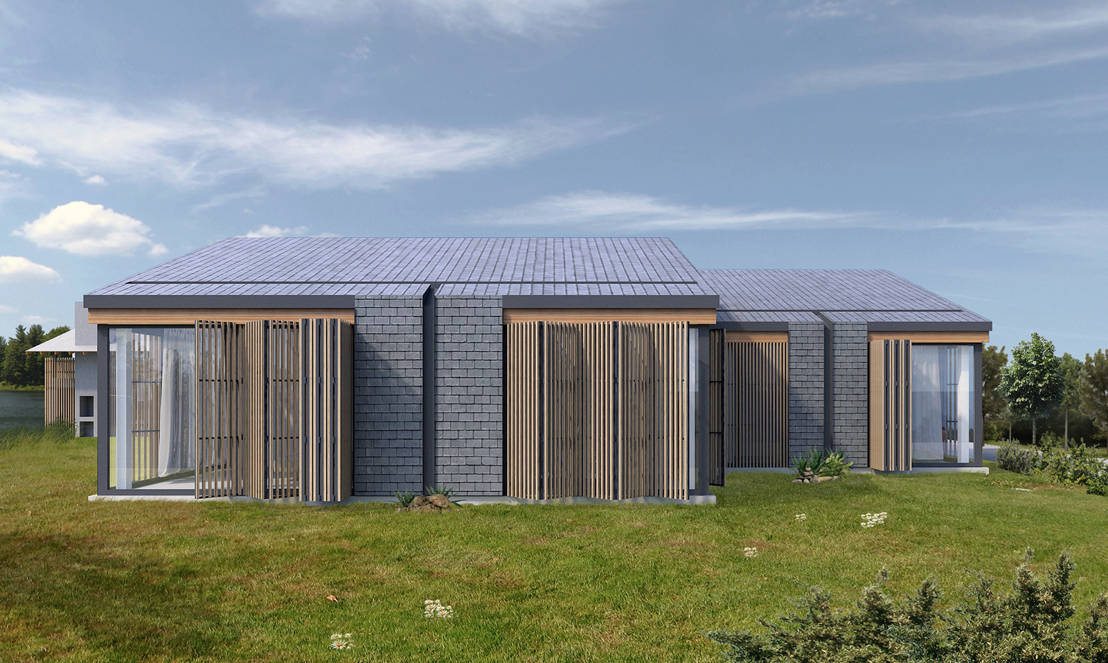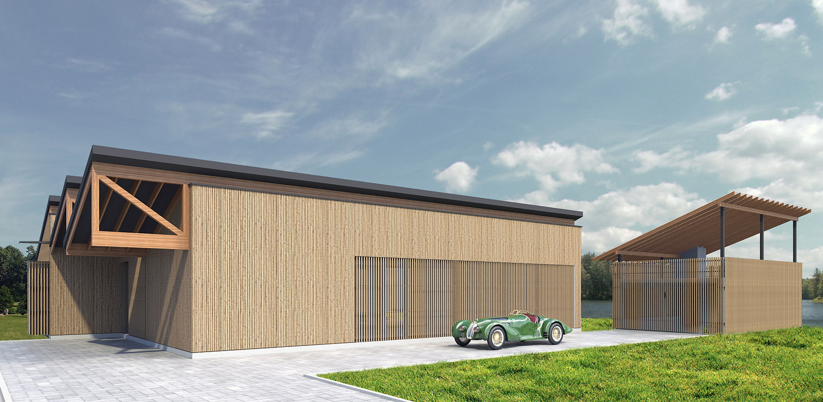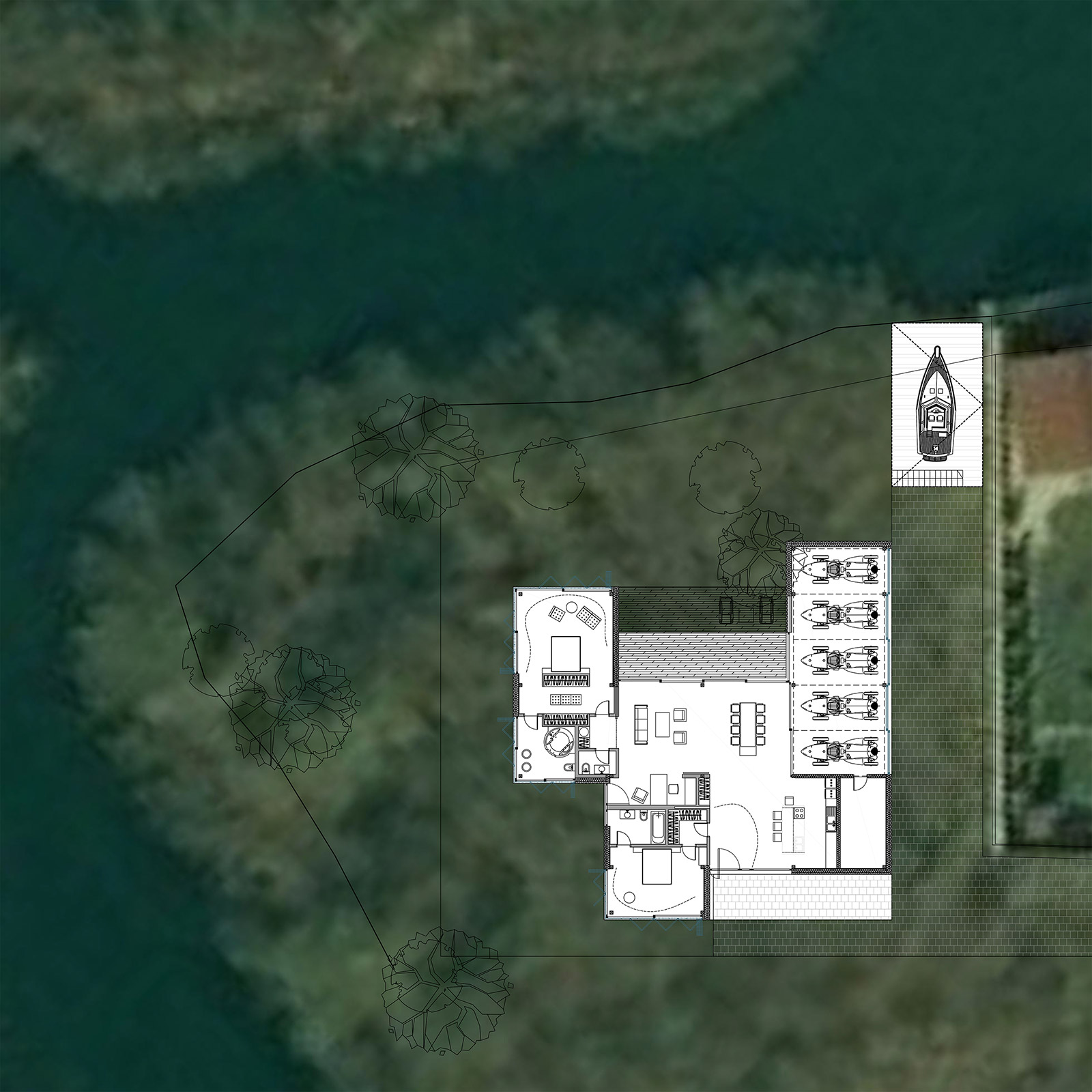 The boat garage accommodates a barbecue pavilion above, inspired by the stylistic elements of the house.