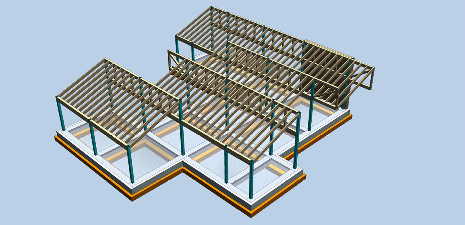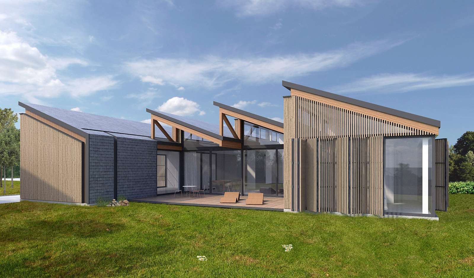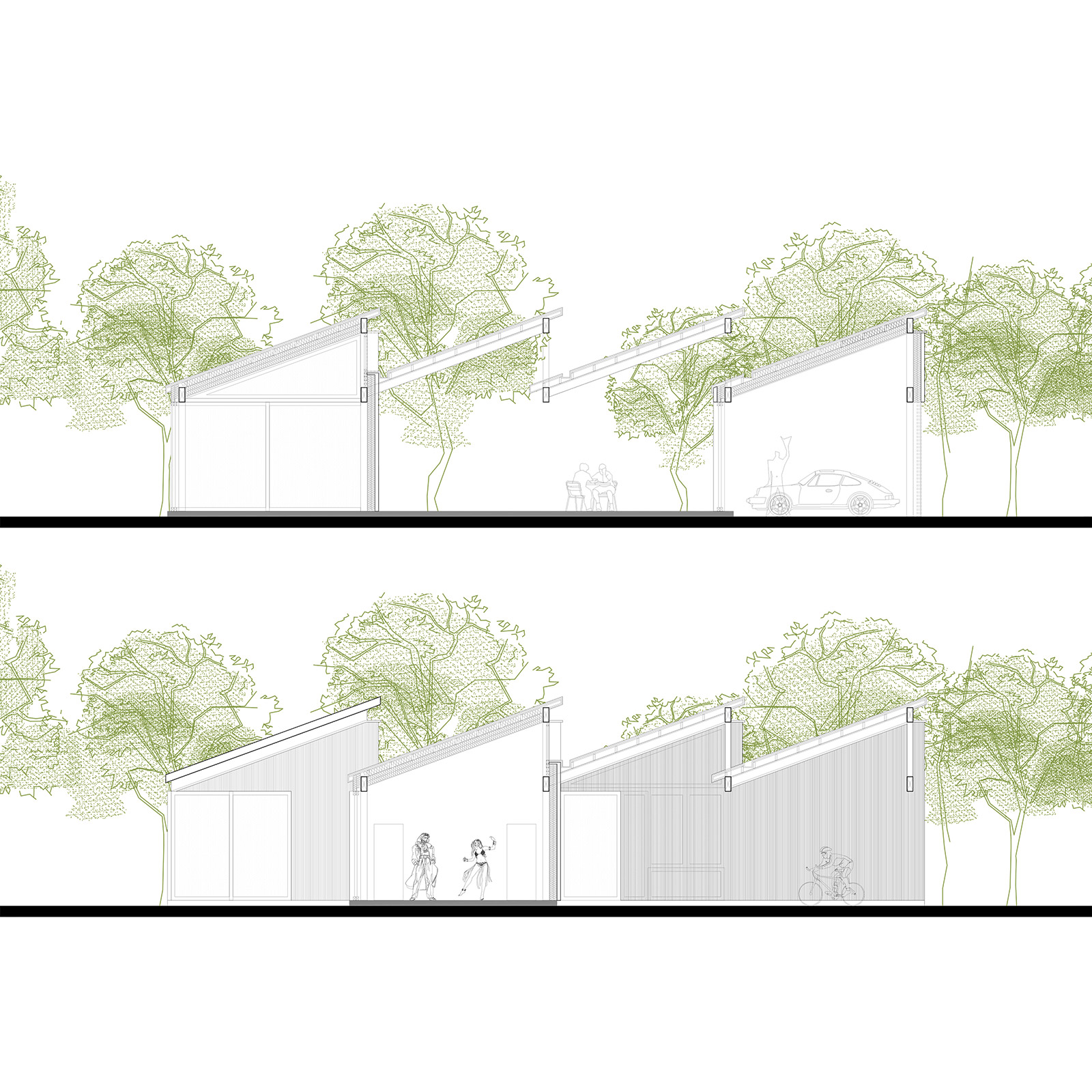 In addition to the maximum glazing, permanent visual contact with the outside, we also worked with the geometry of the roof to increase the relationship between the interior and the sky. A series of sheds oriented to the northeast generate a diffuse light on the entire surface, the perceptible contact with the sky becoming a fact in any corner of the house. The structure with metal poles and wooden trusses allows this necessary flexible configuration. In the logic of discrete integration in the site, we proposed the use of slate as covering material of the opaque areas of the exterior.