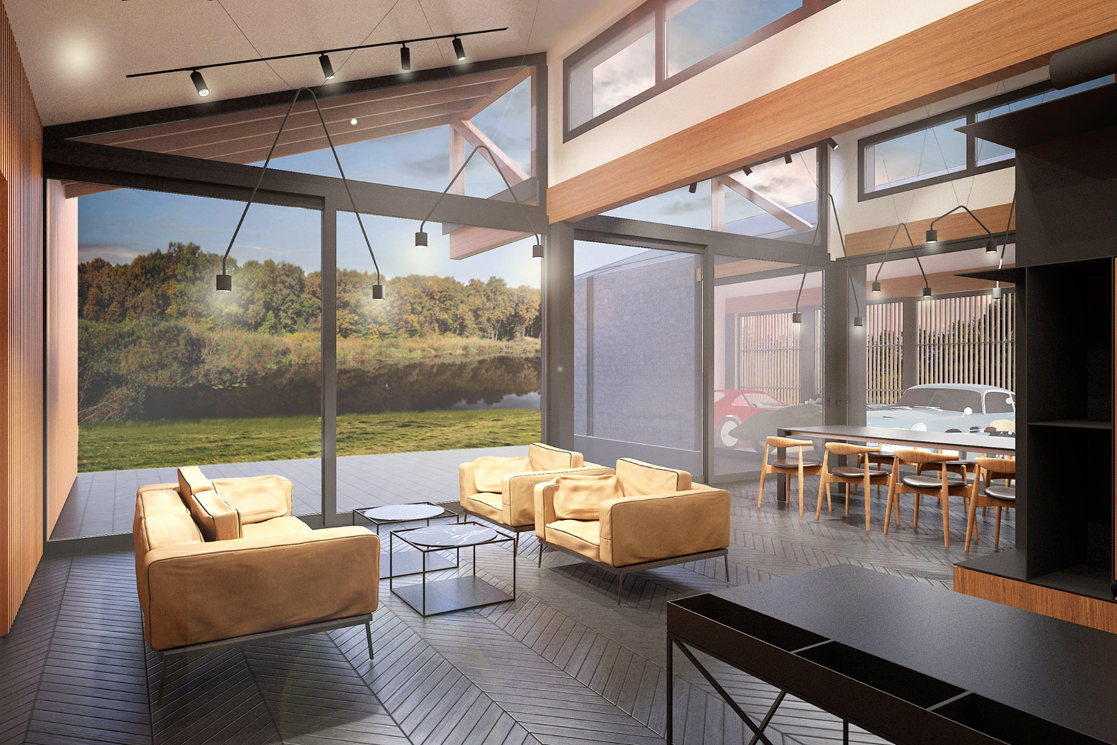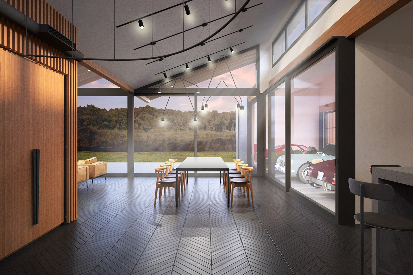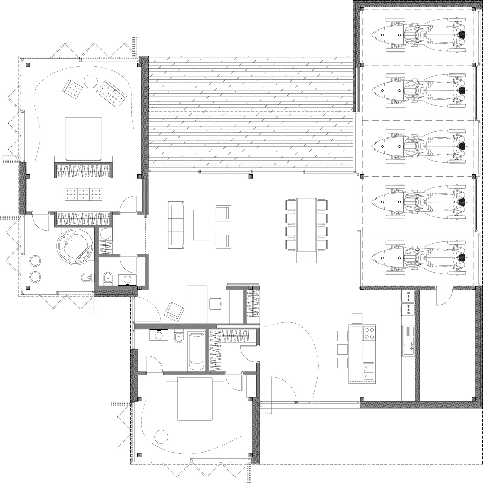 Beyond the design theme, a holiday retreat near Snagov Lake with a generous garage for the luxury car collection, the project really started with the visit to the site. Vlăsia Forest, reflected in a tongue of water of Snagov Lake on two sides of the site, is a defining moment for the initial inspiration. The project was not to ruin this significant quality of the place, but to build an intermediate space, a general exterior protected from the weather conditions.