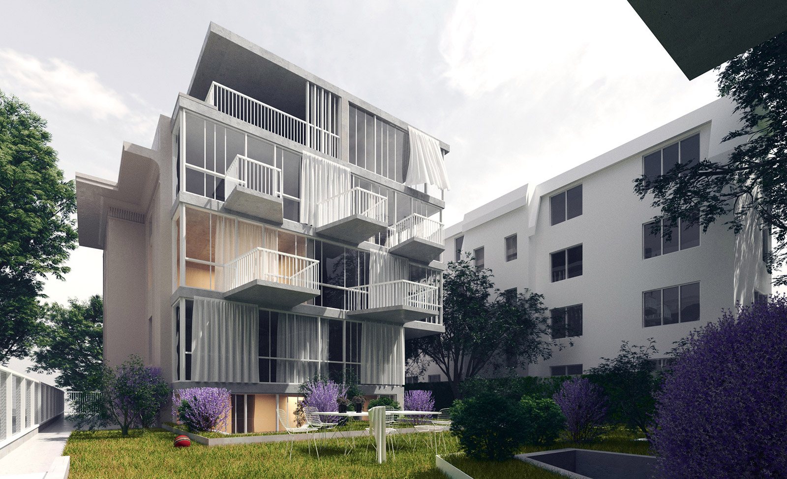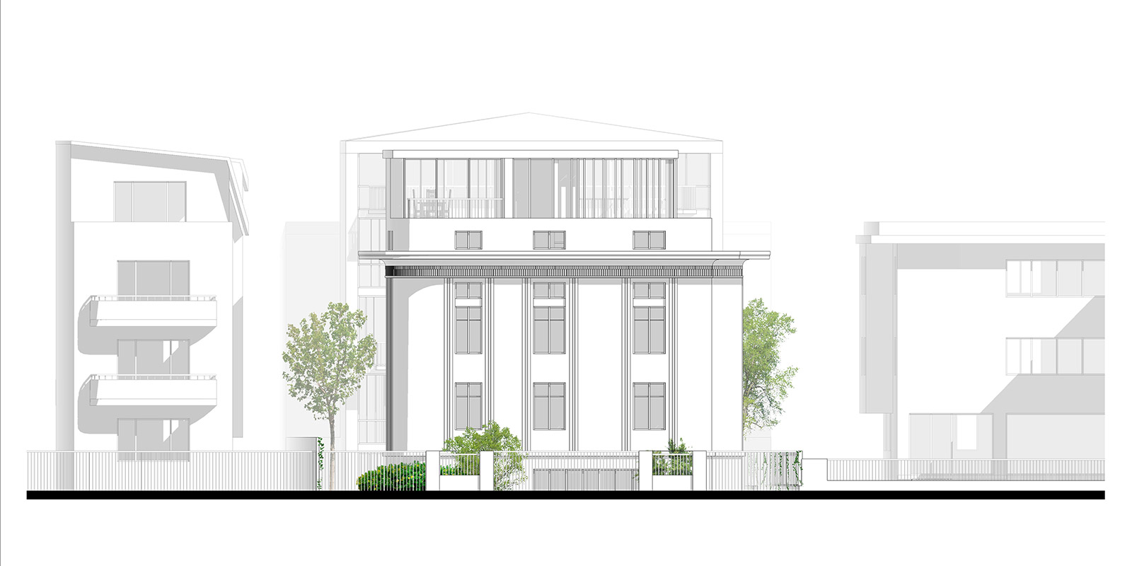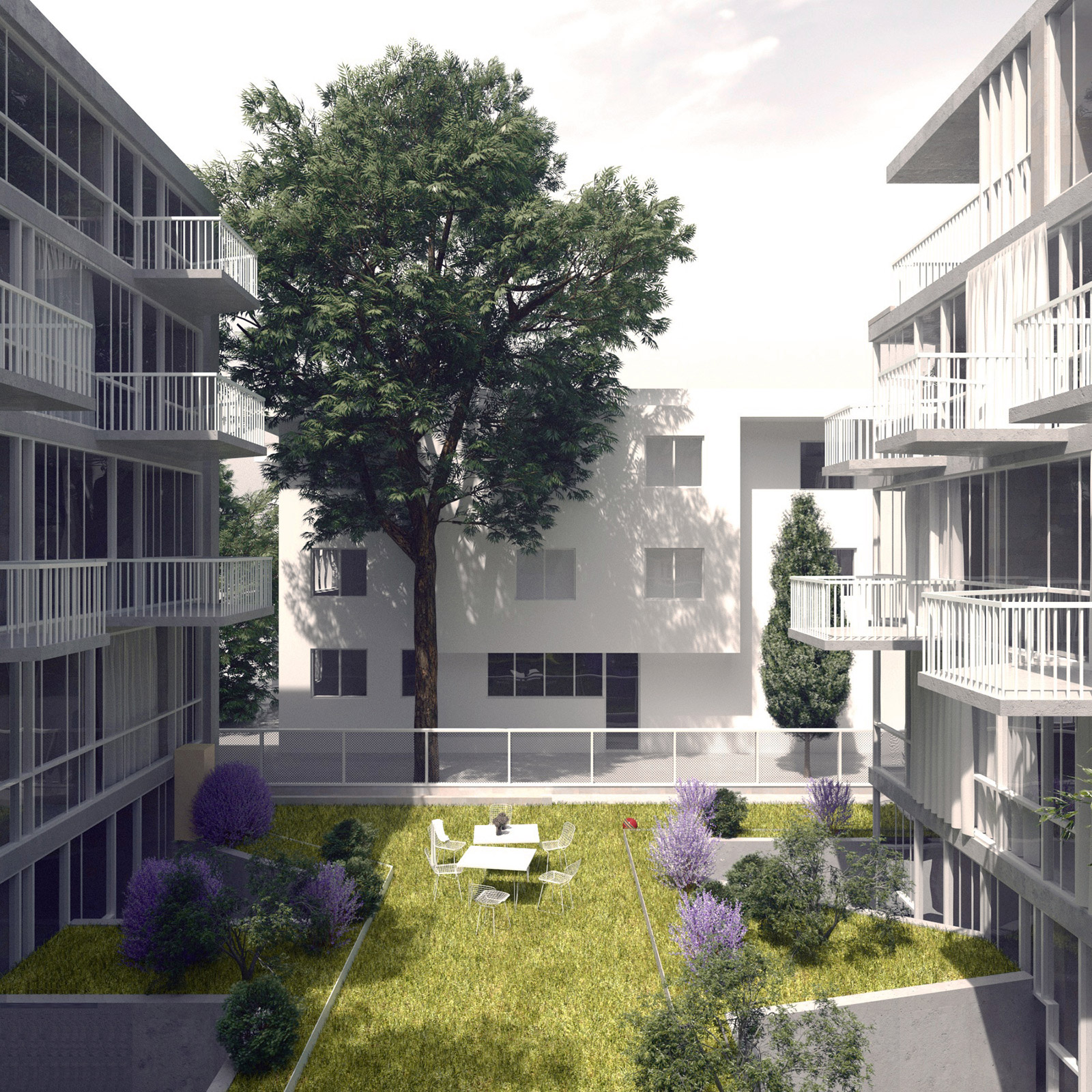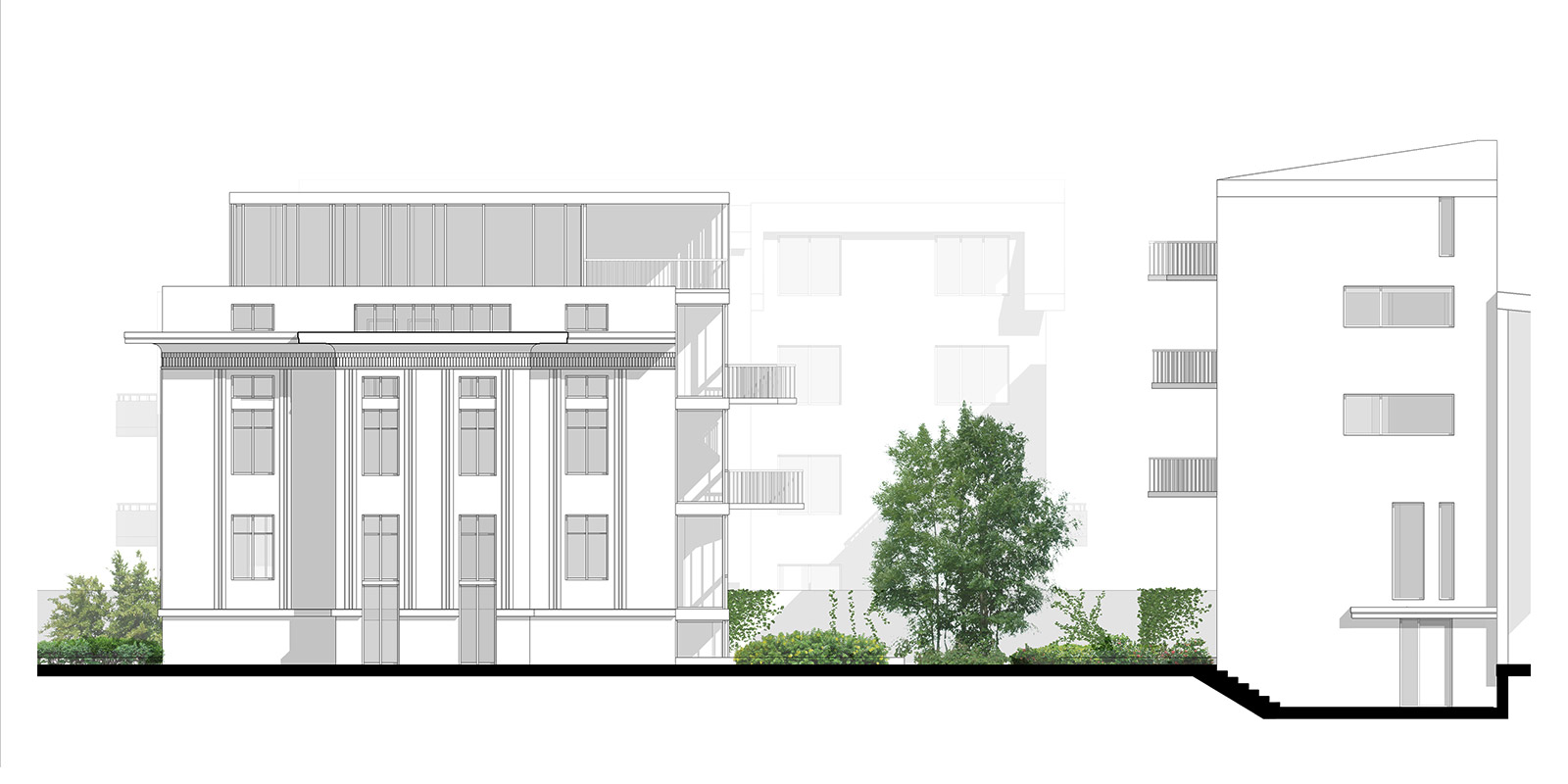 An existing villa on a rather large and deep site is rehabilitated and reorganized into a multi-apartment building, alongside the addition of a new building at the back of the plot that covers the existing blind wall and ensures an efficient use of the existing deep courtyard. In this manner a generous collective garden is created inbetween the two buildings, which open further towards the exterior through several individualised balconies and terraces.