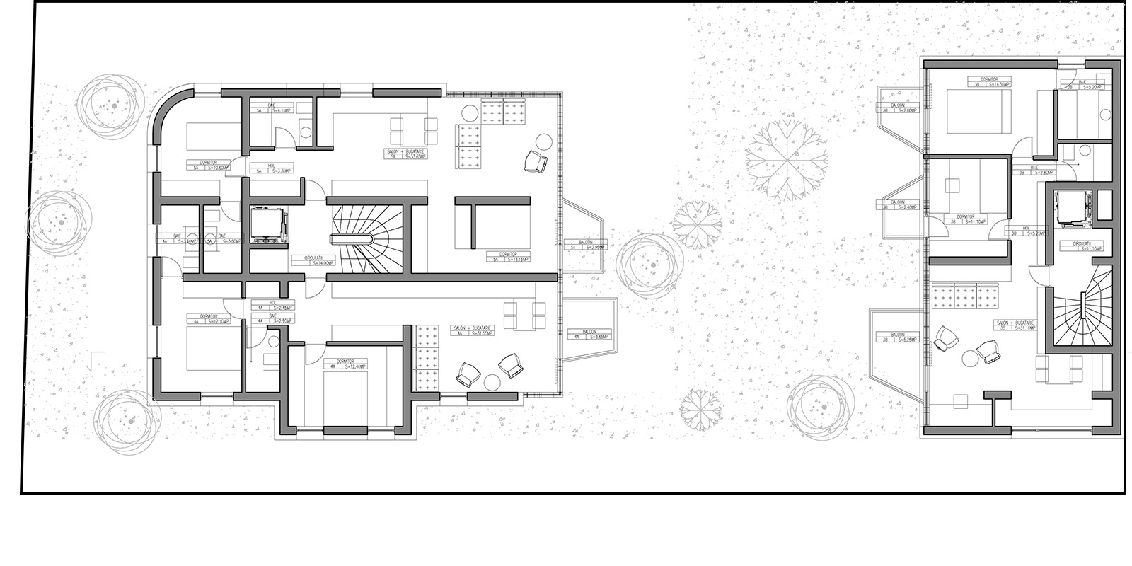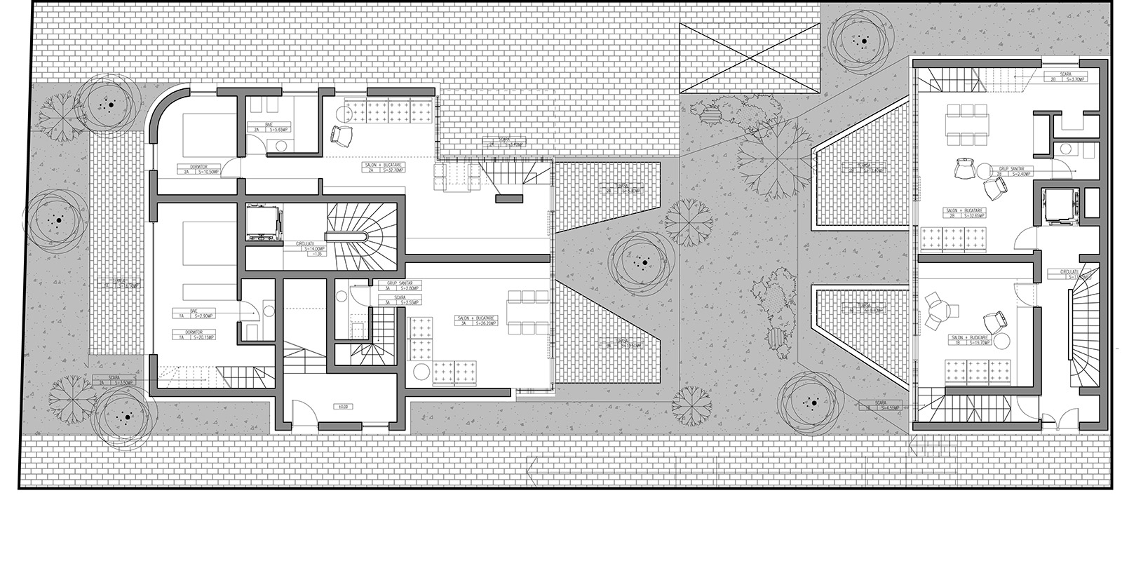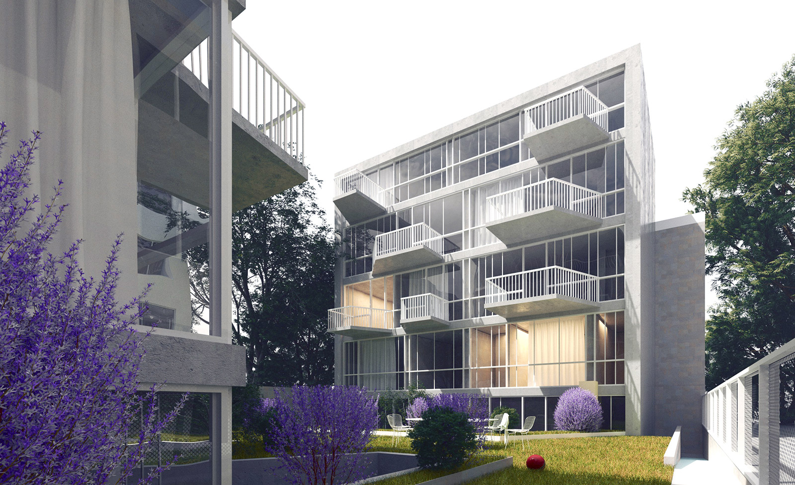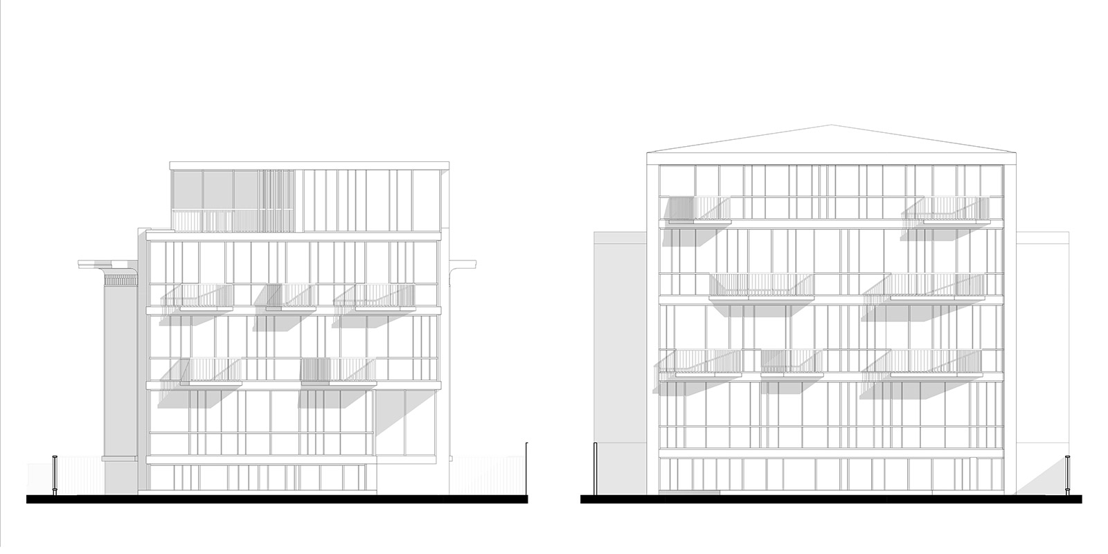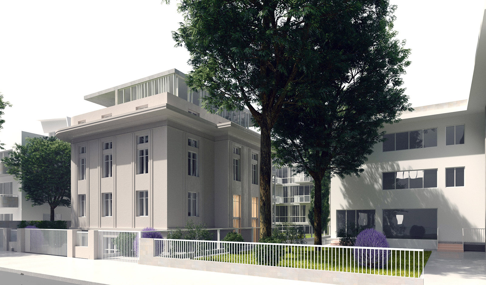 An existing villa on a rather large and deep site is rehabilitated and reorganized into a multi-apartment building, alongside the addition of a new building at the back of the plot that covers the existing blind wall and ensures an efficient use of the existing deep courtyard. In this manner a generous collective garden is created inbetween the two buildings, which open further towards the exterior through several individualised balconies and terraces.