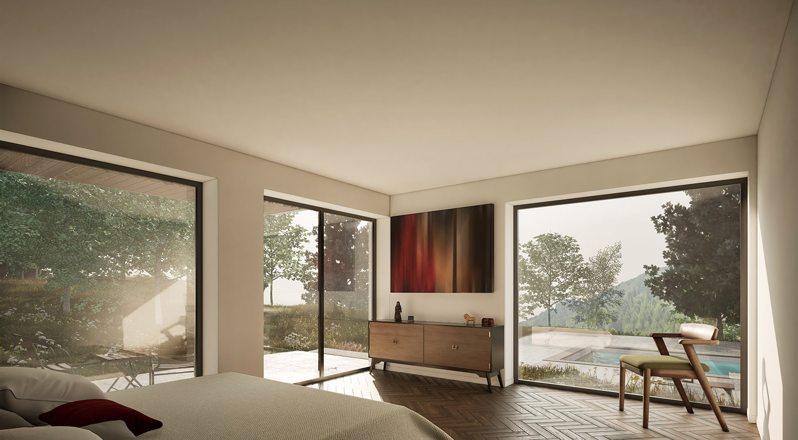 The main bedroom opens up furthermore to the existing orchard on the side, advancing into the rows of existing trees.