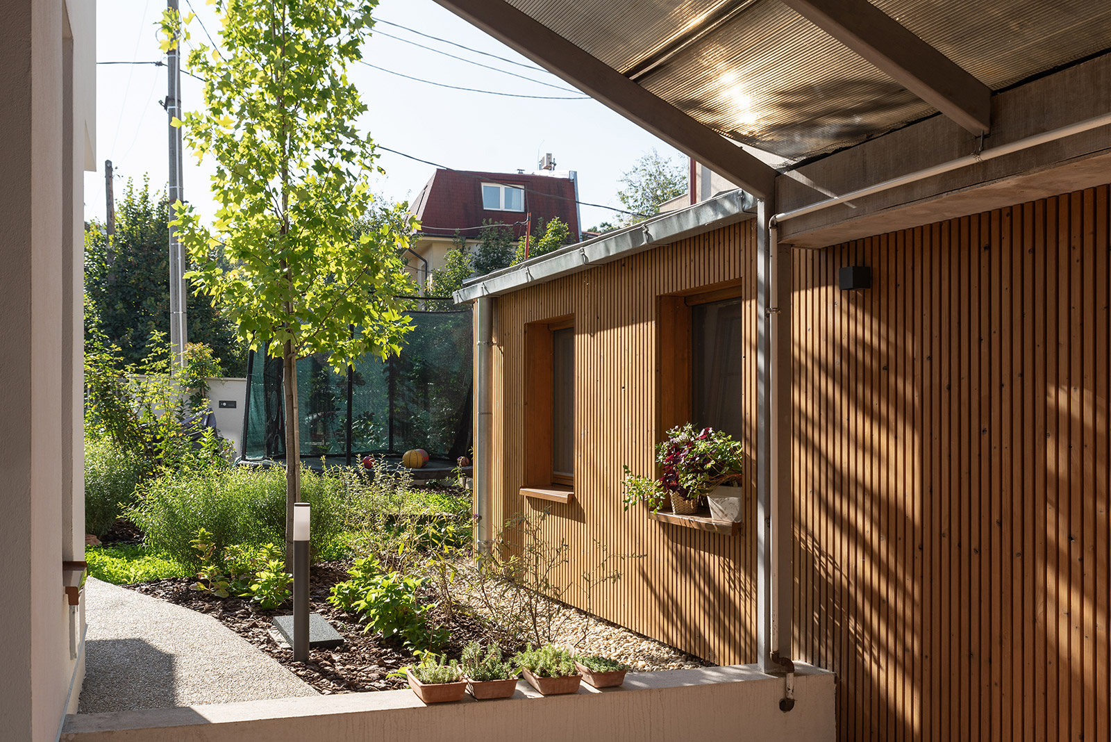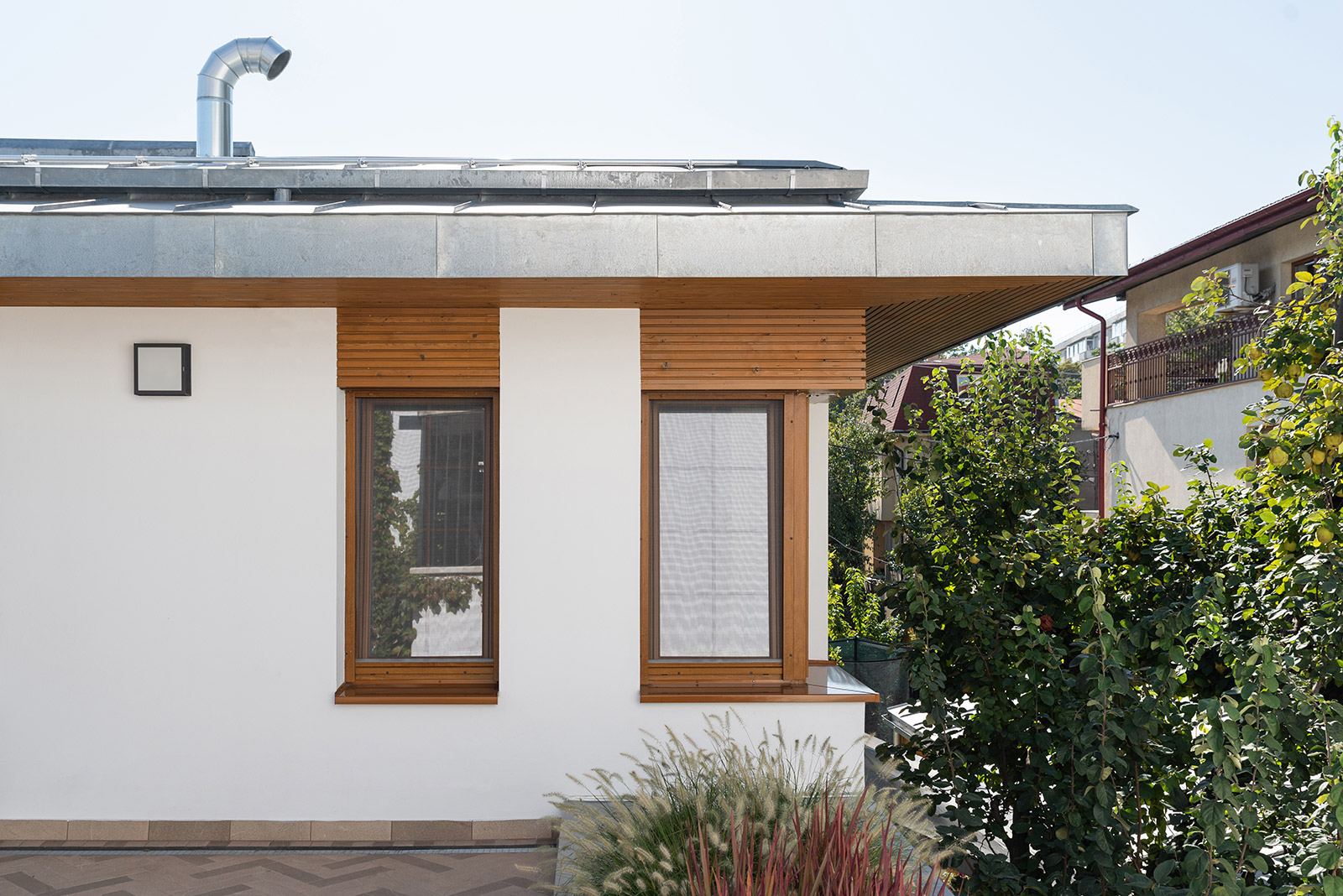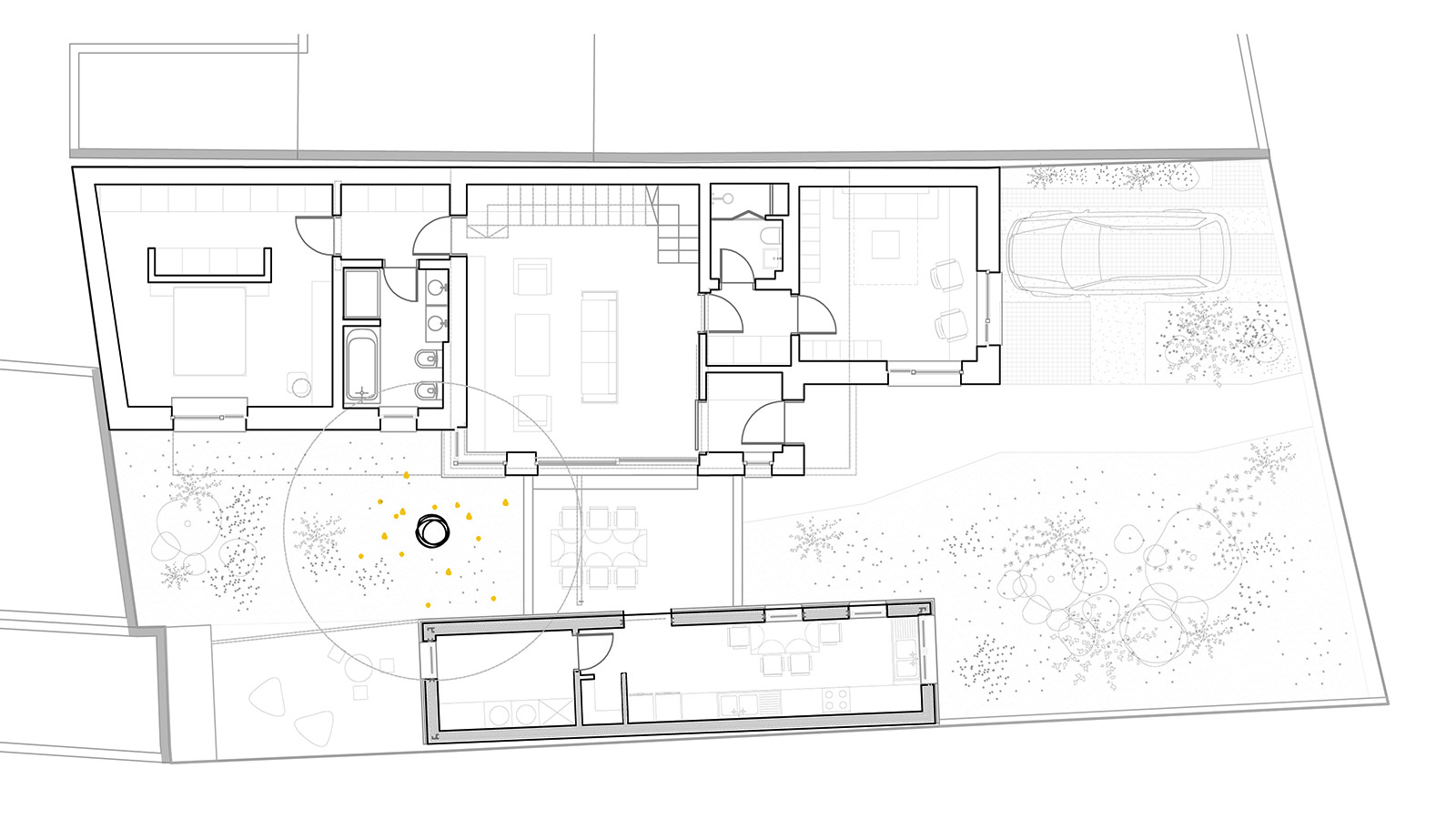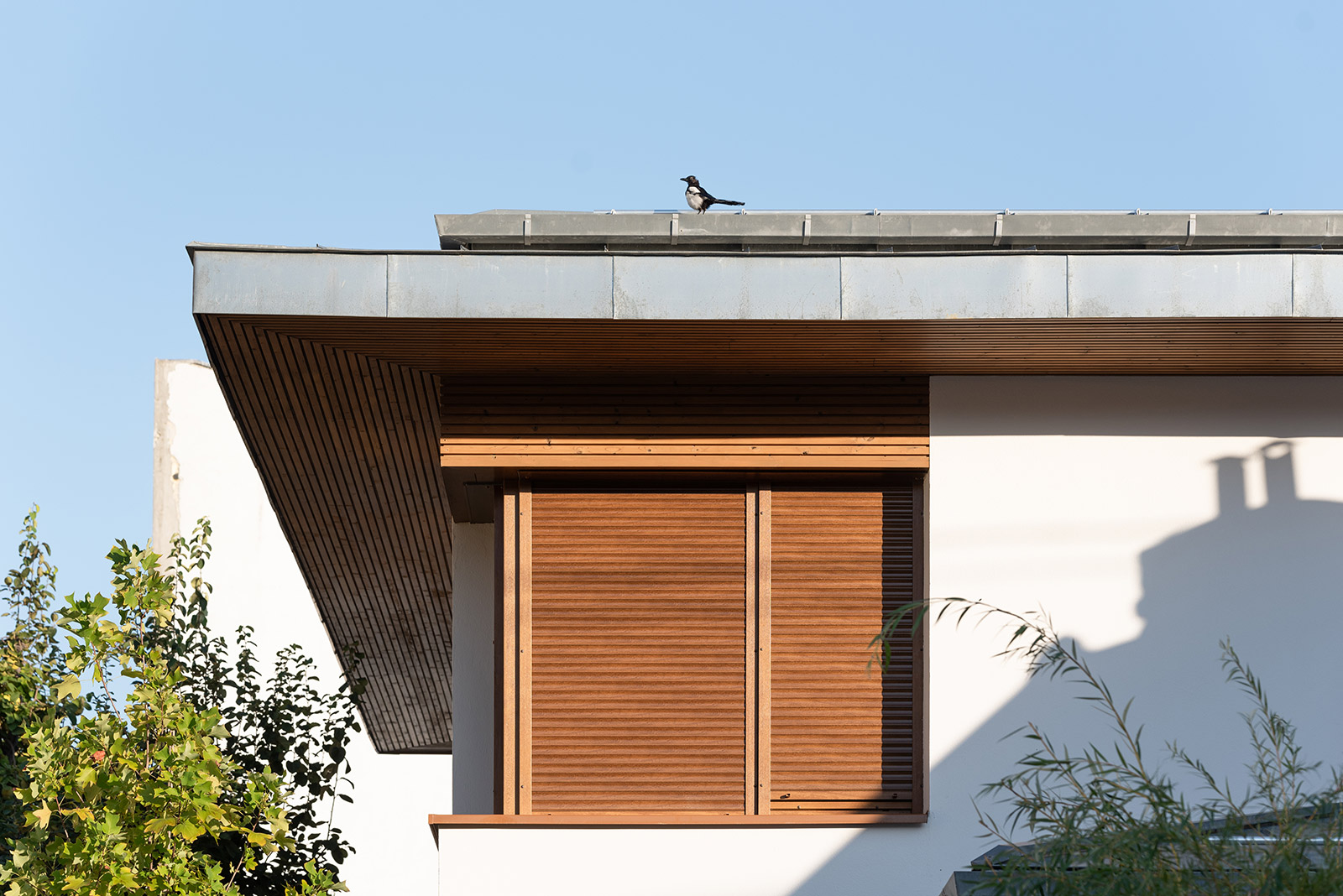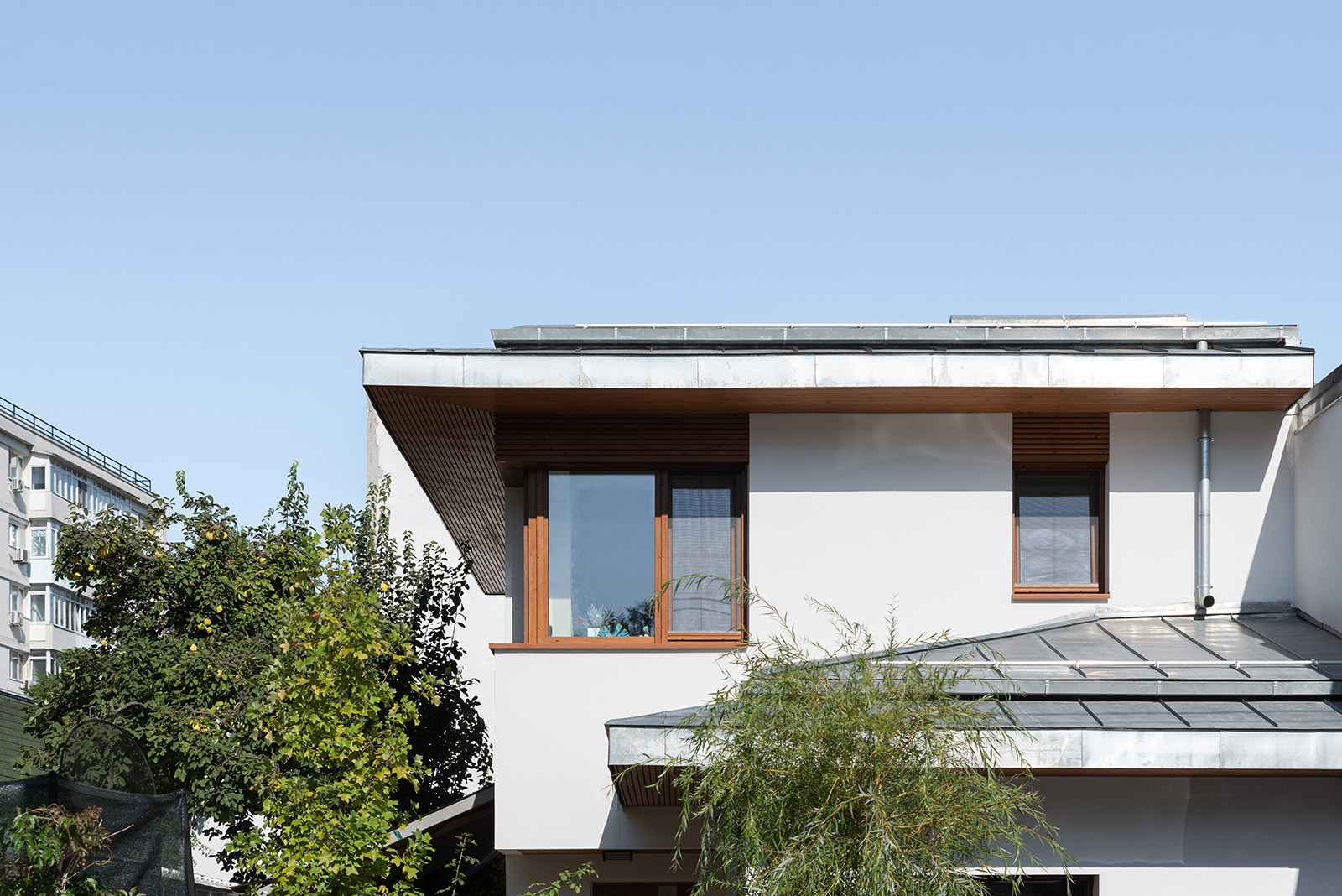 The rehabilitation of the main house was designed on the same footprint, with a large room in the middle of the dwelling, a guest bedroom facing the street garden and an intimate room towards the back garden. The upper floor features two bedrooms with diagonally oriented windows, facing the the areas the greatest spatial depth. In this configuration, the dwelling does not turn away from the street in order to form an exclusively private garden, but allows dwelling in the garden, all the while maintaining contact with the street and the city.