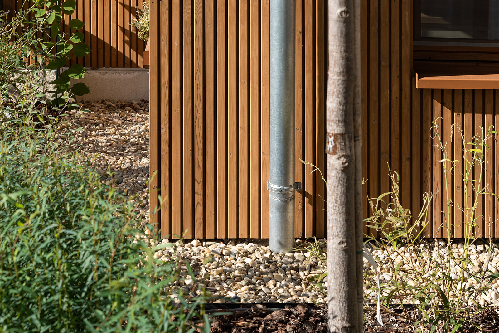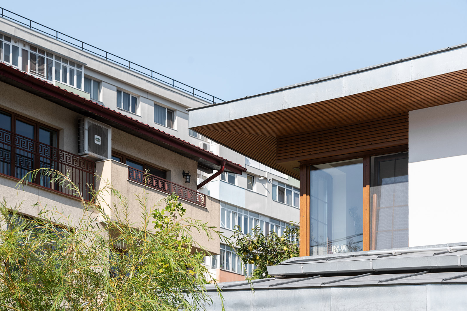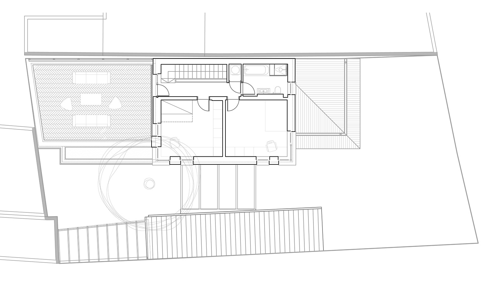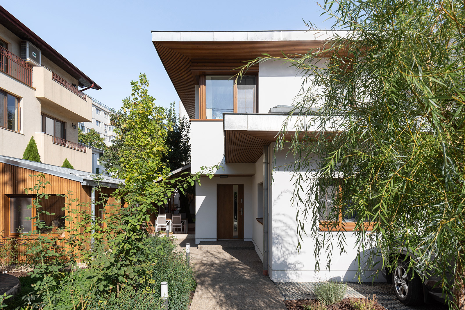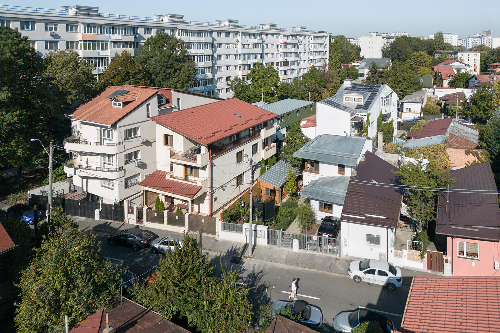 The rehabilitation of the main house was designed on the same footprint, with a large room in the middle of the dwelling, a guest bedroom facing the street garden and an intimate room towards the back garden. The upper floor features two bedrooms with diagonally oriented windows, facing the the areas the greatest spatial depth. In this configuration, the dwelling does not turn away from the street in order to form an exclusively private garden, but allows dwelling in the garden, all the while maintaining contact with the street and the city.
